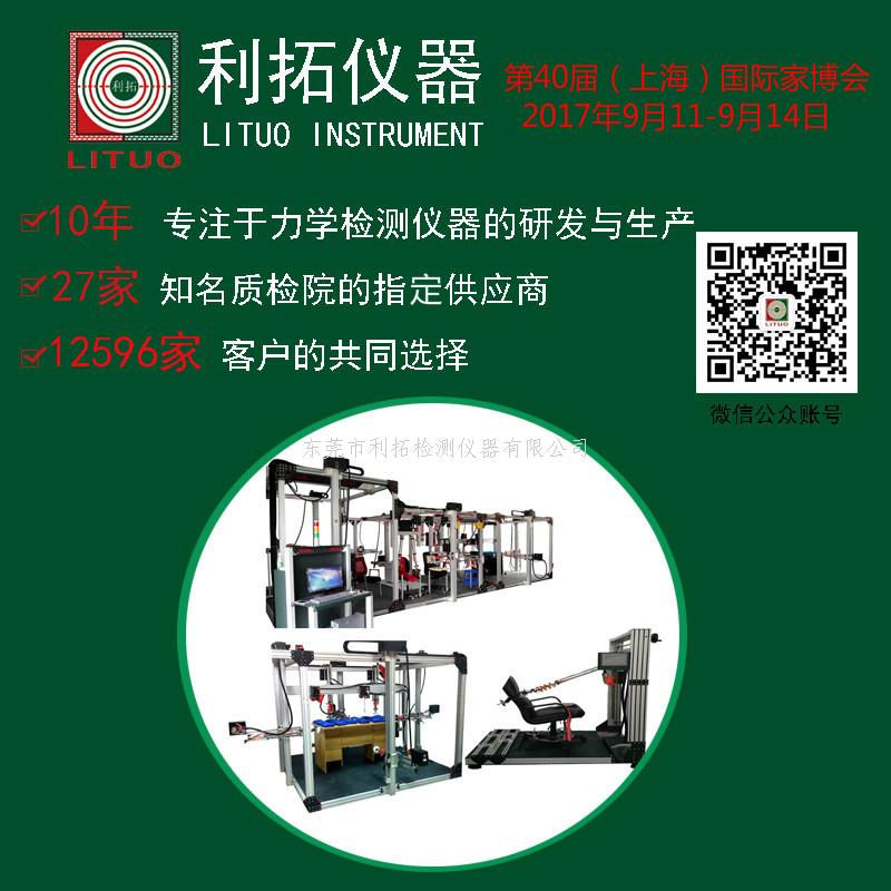 利拓仪器作为家具行业检测仪器领导品牌,受邀亮相第40届中国(上海)国际家具博览会,为家具行业质量检测提供相应仪器,并与广大家具行业同仁交流与对话,共同开拓全球家具行业的发展新道路!